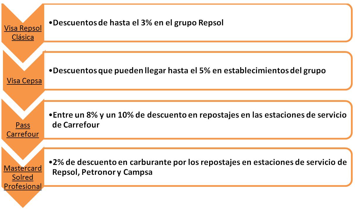 Una tarjeta que viene a  ofrecer descuentos de hasta el 3% en el grupo Repsol; un 2% sobre compras realizadas en estaciones de servicio del grupo y 1% sobre compras realizadas en cualquier establecimiento con la tarjeta, que en el mes de liquidación no rebase los 400 euros. Existen diferentes modalidades para esta tarjeta; Oro, Platinum o Electron, en las que estos descuentos no varían ya que la variación fundamental tiene que ver con las prestaciones de la tarjeta en otros órdenes de funcionamiento.